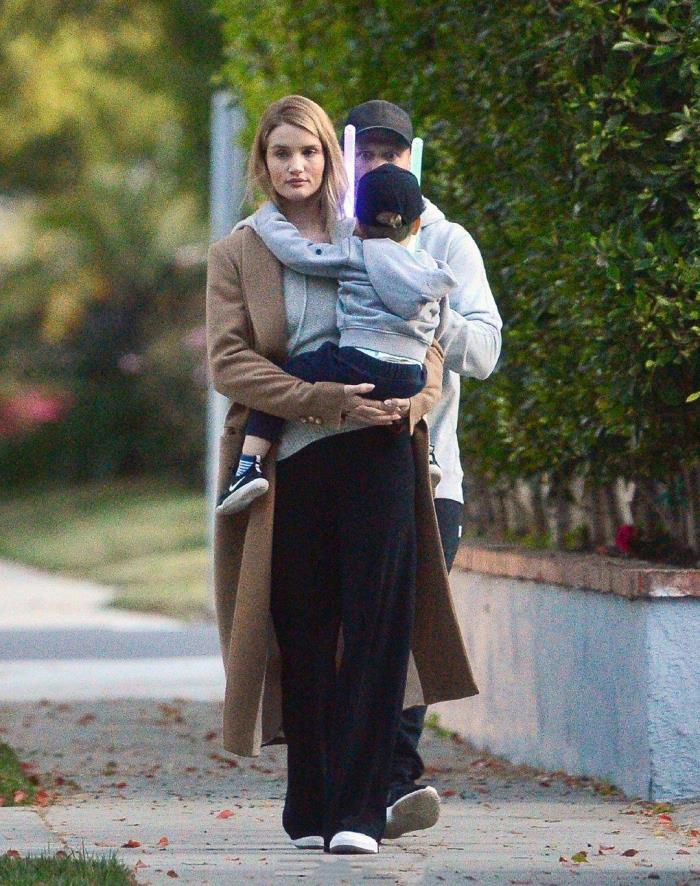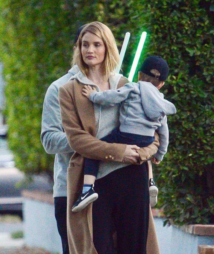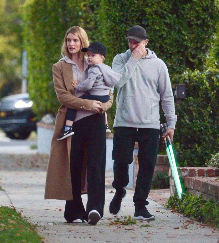 尤其是罗茜双手托娃展现出超强的妈妈力,杰森走在后头手拿两根“光剑”正在逗儿子开心,不难看出他正瞪着眼睛做出搞怪表情,与他荧幕里的硬汉形象有一点反差萌!这一家三口出街真的是低调有爱的模范一家人!