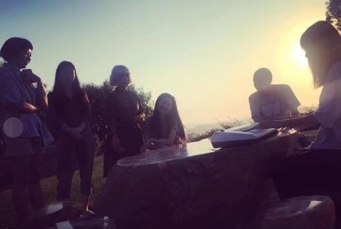 黄立行坐在身边暖心陪伴,好友们围成一圈听她弹古筝,斜阳西下,岁月静好,黄立行和徐静蕾两人安静的坐着,身边好友的们被喂饱了满满的狗粮。