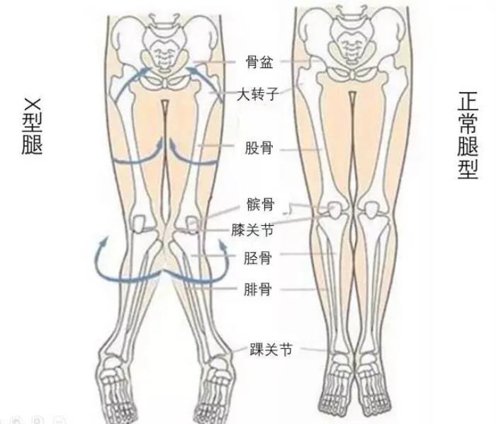 X型腿和O型腿的出现,都是因为膝关节变形所引起的。正常的腿型,当人两脚并拢,完全放松双腿直立时,大腿中段、膝关节、小腿中段、脚踝处会有4个接触点;膝关节的上下方处,会有2个菱形缝隙。