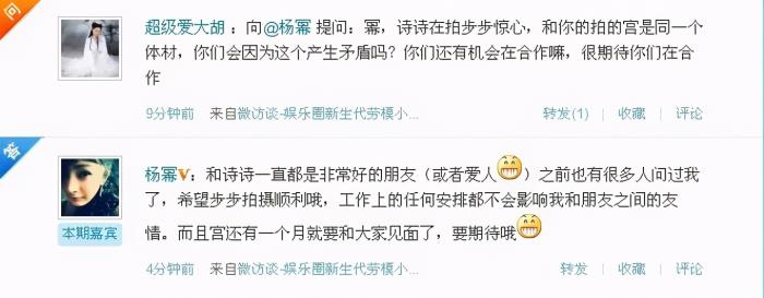 而且两人在微博上毫不掩饰自己的亲密。两人因为《仙剑奇侠传3》走红,2年后开始了“穿越一姐”之争,杨幂主演的穿越剧《宫锁心玉》于2011年1月31播出,刘诗诗主演的《步步惊心》于2011年8月11日播出。同一年,同一类剧种,同样都是康熙年间“九子夺嫡”的故事,人物大多也同名,这不免让大家把他们两人放在一块儿比较。虽然让二人大火的《宫·锁心玉’》和《步步惊心》被指太过相像,但丝毫没影响到两个人的感情,反而互相宣传。