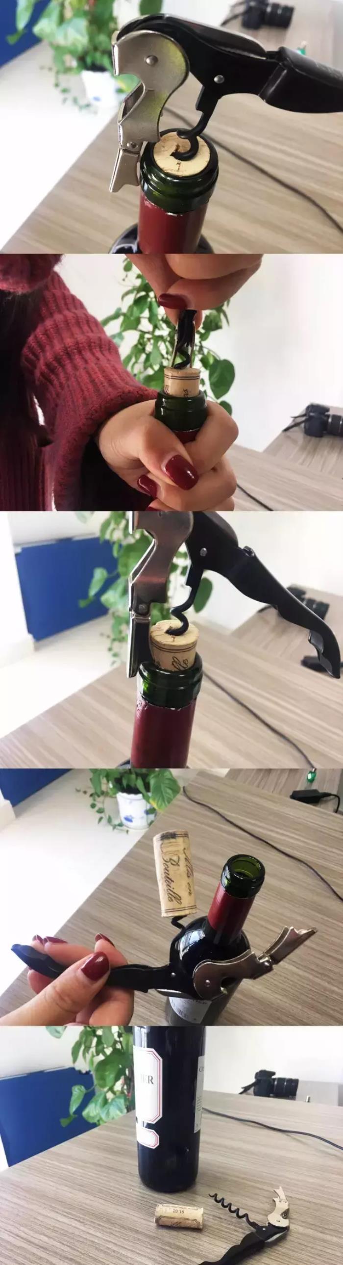 用酒刀自带的小刀沿瓶口割开酒帽。将酒刀螺旋锥尖端顶在瓶塞稍微偏离中心位置,将螺旋缓慢垂直旋入酒塞。酒刀只剩一两个螺旋露在外面时就不要旋转了。将酒刀第一级杠杆卡在瓶口(小编最初开瓶时就弄错这里,没卡住,手弄得生疼还拔不粗来,大家记得一定要卡住),将木塞拔出一部分,接着再用第二级继续同样操作。如果还没拔出来,可握住酒刀转套处逆时针扭出瓶塞。为了让你的葡萄酒更好喝,