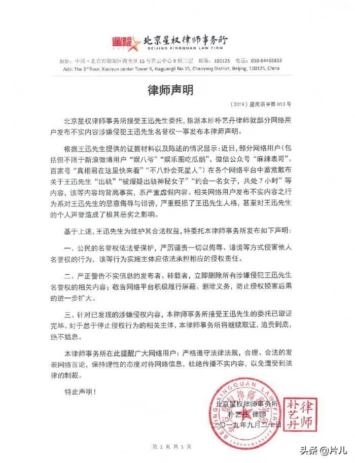 9月20日,王迅针对网传其“被爆疑出轨神秘女子”和“约会一名女子,共处7小时”等内容进行辟谣,并发布律师声明称,该等内容背离事实系虚假消息。同时表示,将对发布以上内容的网络用户进行追责。