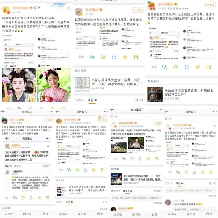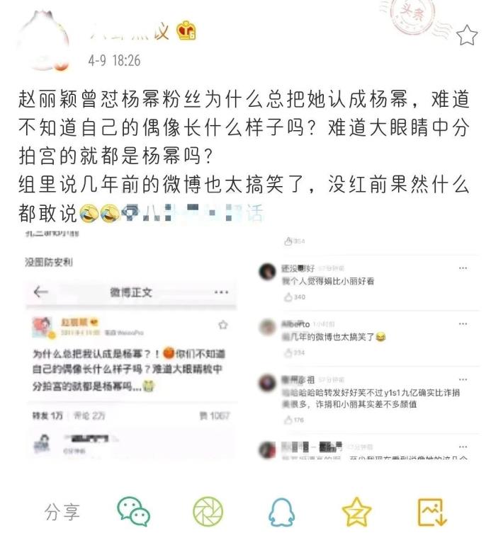 这条微博当时闹得轰轰烈烈,赵丽颖一度被网友大骂碰瓷,赵丽颖粉丝也认为是杨幂粉丝自己认不出自家正主尬黑,两家剑拔弩张形同水火。此后赵丽颖也解释自己只是因为工作受影响,随手发微博抒发心情,没有其他意思,随着几部作品的大爆才扭转了网友对她的偏见。