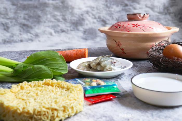 1..准备海鲜味泡面、胡萝卜、青菜、鸡蛋、牛奶、虾