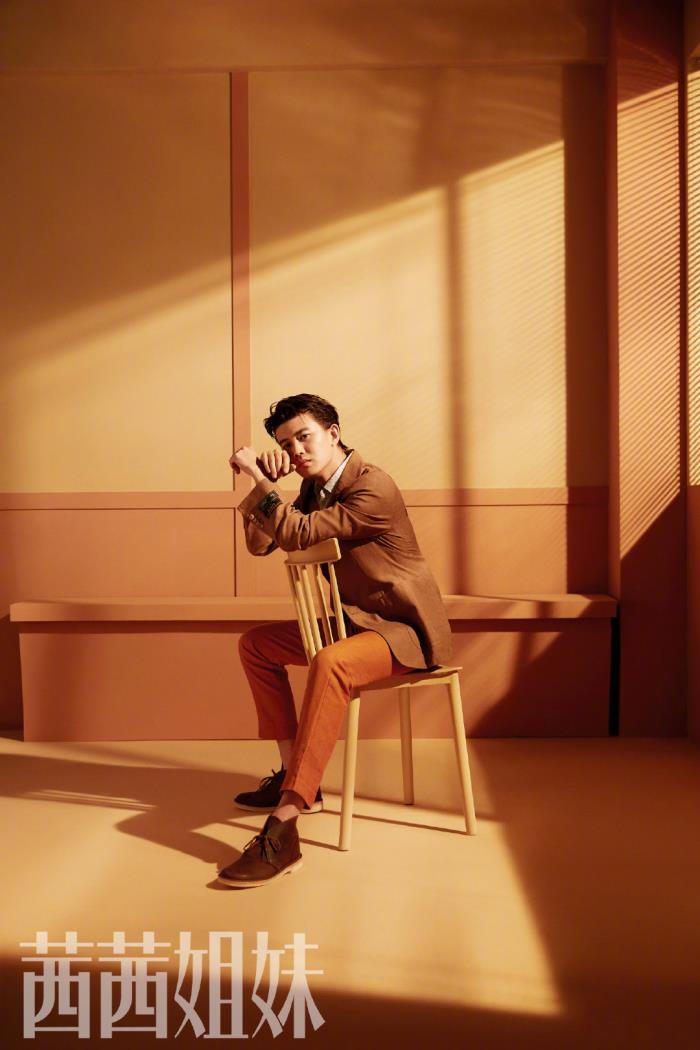 棕色系的西装则让他多了几分绅士和成熟感,上半身深棕色,下半身带点橘色的棕色,成熟中不是活力,配合这夕阳下的暖黄色拍照,简直完美。