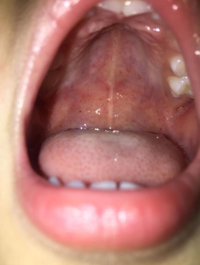 把宝宝放在大腿上,找一个方便把手指伸进嘴里的姿势,能清楚地看到口腔内部。