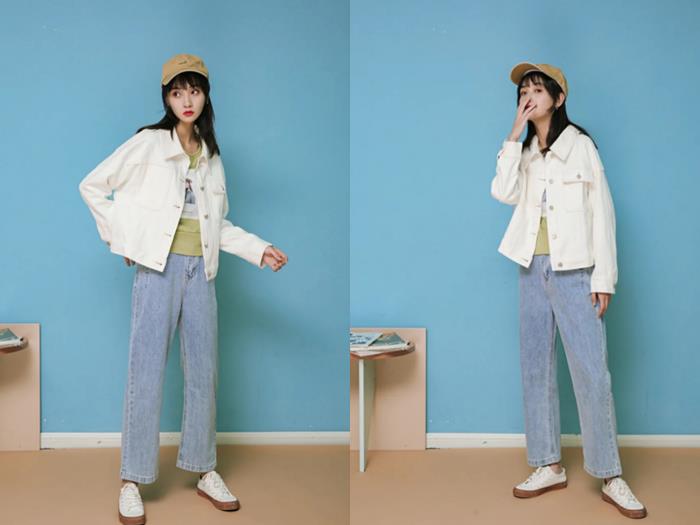 一说到牛仔外套就会勾起你们对时髦的想法,有没有?大家心目中的牛仔外套是不是蓝色的呢?随着时代的进步,潮流的转变,这款米白色的牛仔外套,让你眼前瞬间一亮,今年备流行的款,改变了经典牛仔蓝色,上身十分显白显气质的哦,基础长度,不挑身材,稍微宽松的效果,显瘦效果超棒,牛仔外套搭配什么裤子?搭配一条水洗蓝牛仔裤,这么穿最时髦最好看了。