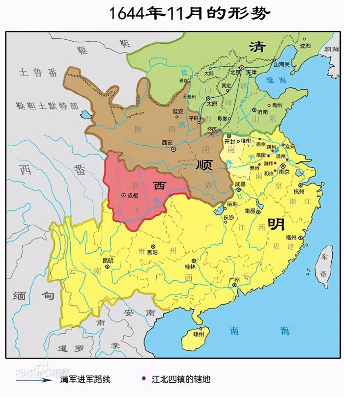 那有的朋友可能要问,明朝时期更不对了,明朝是一个大一统的朝代。这里我们要说的是剧中有曾经介绍过当时的年代是武朝末年。那么在明朝末年其实明朝曾经有过一段时间类似于三家争霸的版图,1644-1662年,李自成攻破北京之后,明朝宗室曾在南方建立了18年的南明政权,因此在地理位置和时间上也能够对应的上。