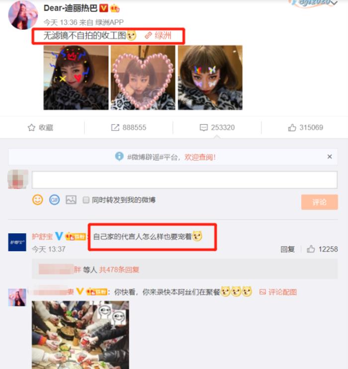 莫浓妆艳抹的,带着滤镜的自拍照一出,让人有一种看到了芭比娃娃的既视感。并且迪丽热巴还配文表示:“无滤镜不自拍的收工图”。只能说,面对这样任性的偶像,粉丝们也只能无奈地宠着了的,就连迪丽热巴的代言品牌官博也表示“自己家的代言人怎么样也要宠着”。