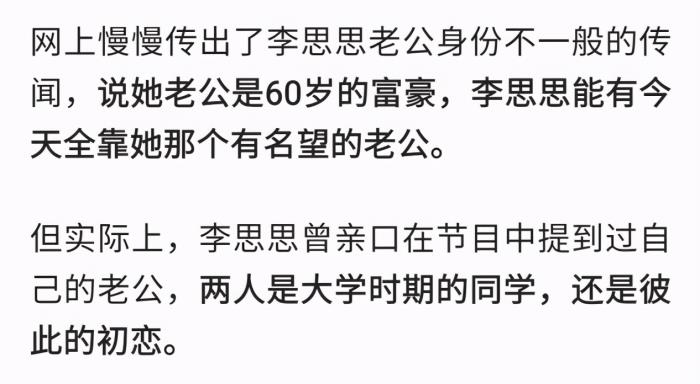 有关李思思老公的身份众说纷纭,有传闻称她嫁了大三十岁老公,也有传闻称两人是大学同学。