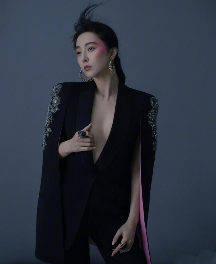 范冰冰身穿一件黑色套装,这款套装的设计非常有特点,这套装虽然是黑色元素来设计的,但她是连体的款式,上身的位置是采用披肩裁剪方式来设计的,衣袖两侧的位置是刺绣的图案,它这个刺绣是采用珍珠和银色饰品来设计的,非常时尚别致,深V领的设计凸出性感女人的韵味,加上衣袖内侧是粉红色的衣料,金色的圆形大耳环和她一脸粉色彩妆相得映彰,衬得整体造型高级不少。
