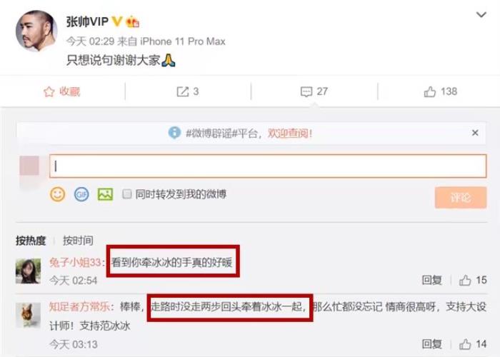 张帅的微博下面,也有不少范冰冰粉丝留言,夸赞“张帅牵手范冰冰真的好暖”,“走路没走两步回头牵着范冰冰一起,那么忙都没有忘记,情商很高”。