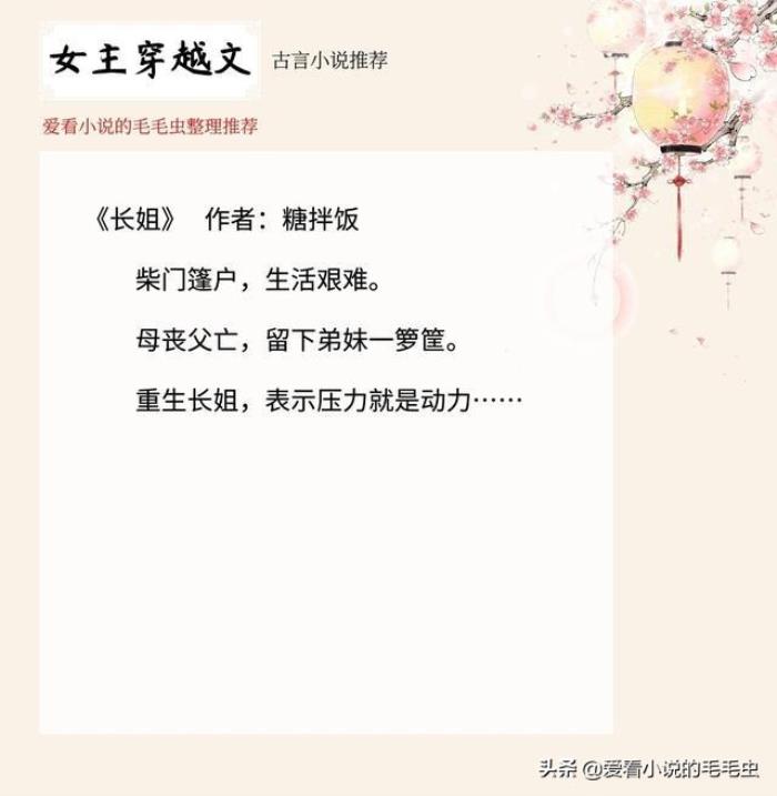 小短评:女主穿到一户父母双亡的家庭。弟妹嗷嗷待哺,家长里短需要费心,女主凭一己之力,供弟弟读书成才,妹妹嫁得良家。非常有责任心的姐姐,带着弟弟妹妹一起奔向小康生活。没有高官、没有暴富,市井百态中护持弟妹的长姐风范。很踏实的一本穿越小说,男主设定也比较新颖接地气,不是什么王孙贵族,但对女主忠犬深情,强烈推荐!