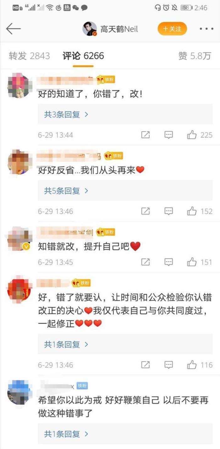 面对高天鹤言辞恳切的道歉信,粉丝们心痛之余,也表示“错了就是错了,足够自省,方能继续出发”。