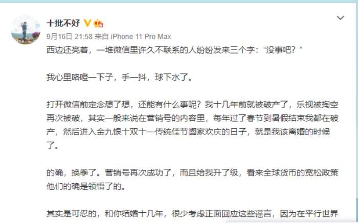 即使澄清,大家也不会放过王珂,这个热点话题一定要蹭一蹭的,越蹭越热。果然,当事人王珂发文了,文中提到,“每年春节到暑假前后我都在破产,然后进入金九银十双十一阖家欢乐的日子,就是我该离婚了,现在真的是到了换季的季节。”