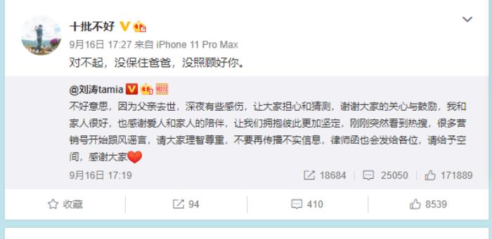之后刘涛发文澄清,因为父亲过世,过于伤感,让大家担心了。澄清是澄清了,但也有一些吃瓜群众不买账,父亲过世,大可清清楚楚的表达,为什么说的不清不楚,给营销号来了机会,这原因我们不得而知。