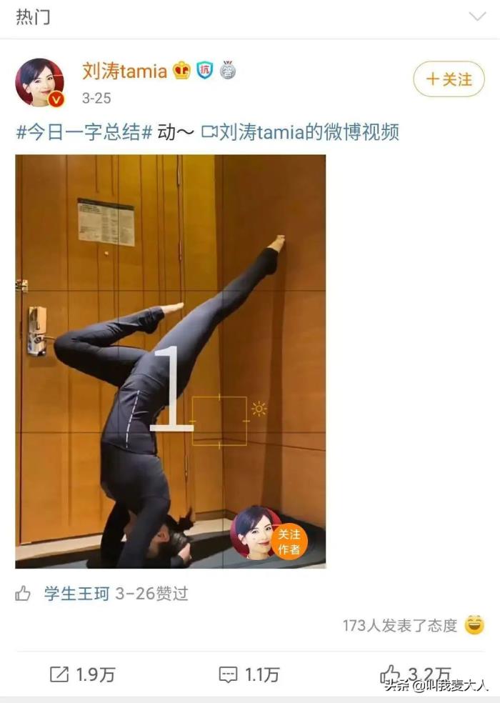 3月25日,刘涛倒立并且配上“今日一字总结‘动’”的视频,在微博迅速走红,被许多网友争先模仿,并很快被顶上热搜。