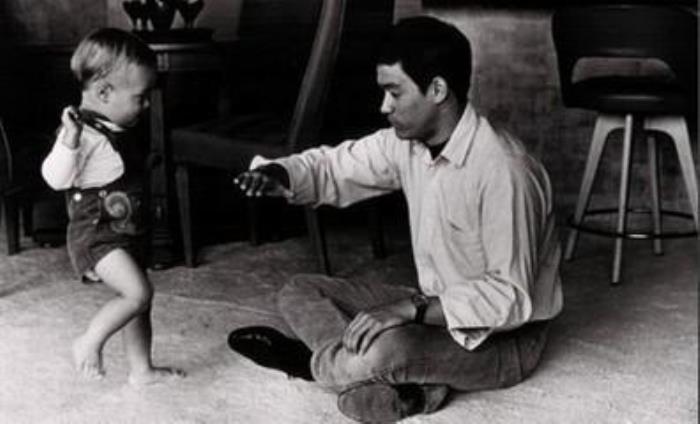 图:儿子在练武,李小龙在一旁搞怪,这张珍贵的照片展现了李小龙作为父亲的柔情的一面,可惜两人没多久后就阴阳相隔。