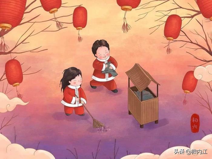 初五刚把财神迎进门,初六就要送走穷神。送穷神这一天,要在家里面进行大扫除,扫出来的垃圾,还有没用的破衣服等等要全部扔掉。此外,还要喝一种素菜汤,这种汤是用菠菜、青菜等七种蔬菜做成的。