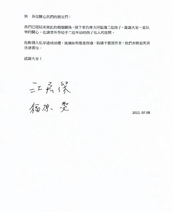 江宏杰所在的公司替他发声明表示:“我们已经结束了彼此的婚姻关系,接下来仍然会共同抚养两位孩子,也请外界给予二位年幼的孩子私人空间。”