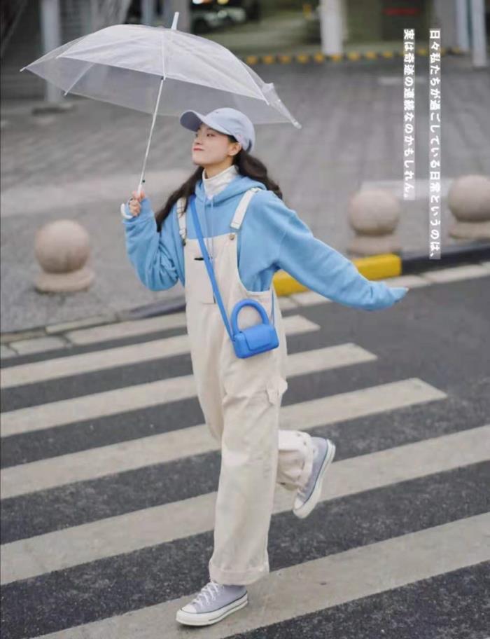 白色背带裤真的是万能搭配单品,搭什么颜色的毛衣卫衣都ok,缺点是容易皱。这身奶蓝色卫衣+白色打底,初春穿刚刚好,背上可爱小包包,雨天也敲开心滴,春天特别喜欢蓝色系,干干净净少年感满满,帆布鞋有点点雾霾蓝的感觉,很清爽适合春夏