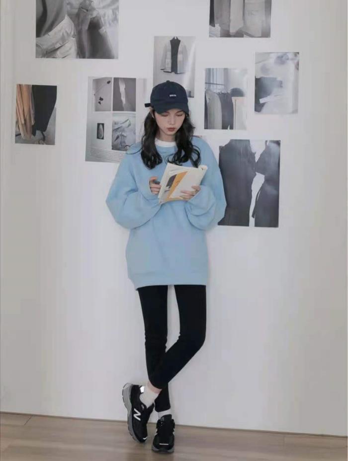 这身穿搭非常的韩系时尚:上衣是baby蓝卫衣,春天喜欢这种粉嫩的颜色,让人想到了甜甜的马卡龙,减龄时尚的卫衣,怎么都不会嫌多,慵懒又随性,在搭配是,选择叠穿了白色的T恤,下装搭配了黑色的打底裤就很时髦。