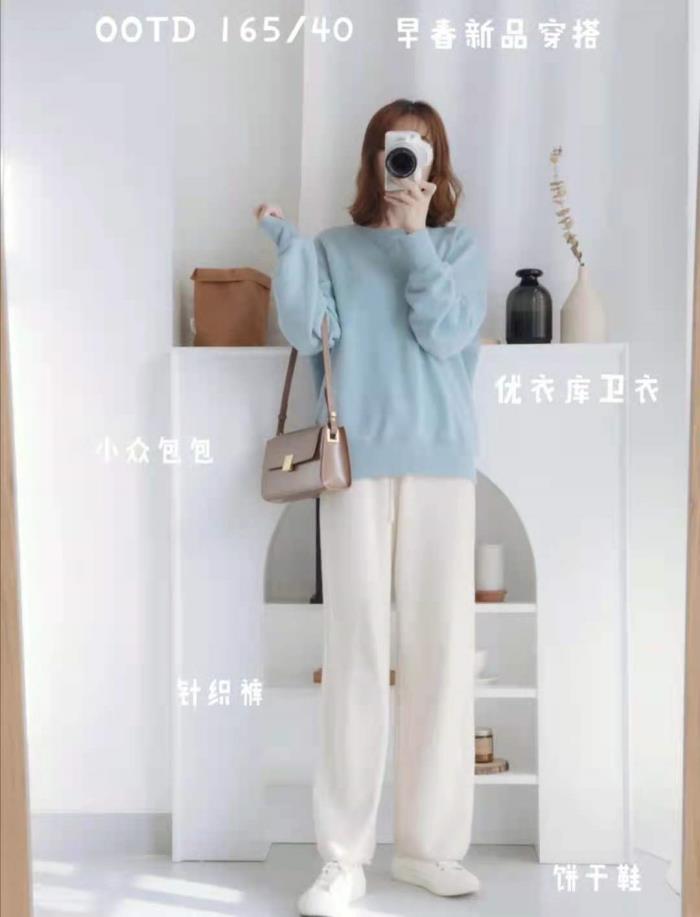 这个套头奶蓝色卫衣颜色也太温柔了,设计是依然极简风,搭配了也是极简风的小众包包,棕色和蓝色搭配竟然意外和谐,简单中带点时髦的小复古,整体感觉也不太一样了,裤子搭配了老朋友白色针织裤,百搭不挑人,温柔系、简约清新必入款。