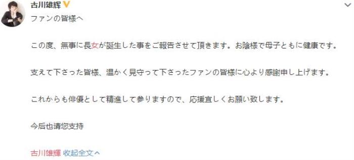 就在10月11日今日下午,古川雄辉发文,宣布妻子已经平安诞下女儿。什么?还没来得及感叹一下失去的男生,现在就有女儿了?一起来看看这到底是怎么回事吧!