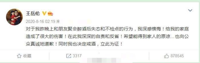 而王岳伦这边则是立马在社交平台上澄清,自称“是与朋友聚会后的失态与不检点行为”,并为此“深感懊悔”,同时也言之凿凿地表示,自己一定会戒酒,并立帖为证。