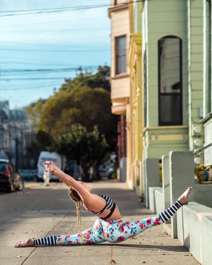 体式要点:劈叉动作进入,右腿向前,左腿在后,慢慢把两腿伸直成一直线,左脚脚背朝下,接着背部和头部慢慢向后下弯,下巴朝上,两手向上伸直举起,手臂贴近耳朵,十指相扣。