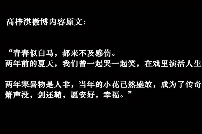 后来两人便疑似分手了,2013年赵丽颖节目采访谈到《新还珠》的时候还悄然落泪,节目播出当天,高梓淇还发了一条疑似回应的微博:“两年寒暑物是人非,当年的小花已然盛放,成为了传奇。箫声没,剑还鞘,愿安好,幸福。”