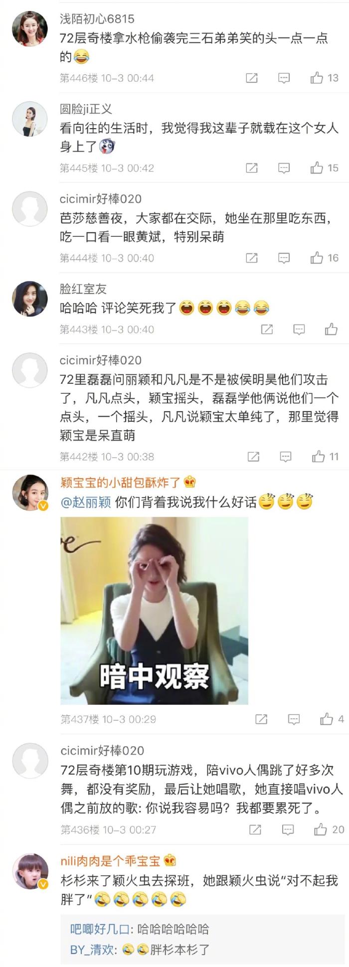 近日有粉丝在微博征集赵丽颖的蠢萌瞬间,没想到话题一出就引来八方虫子踊跃发言。比如“在向往的生活上炕的时候被自己的鞋带差点绊倒”、“要盼盼唱年轮,发现上热搜了一条条的又删掉”、“向往的生活里说我最近胃口不太好,然后一直都在吃吃吃”、“偶来 吸管拼图结果口水流出来了哈哈哈哈哈哈”,看完这些“黑历史”可以说颖宝宝就是蠢萌本萌了,不知道网瘾少女看到粉丝们的评论会被会对着手机爆笑呢?