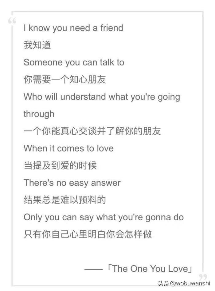 这首《The one you love》来自老鹰乐队解散之后,Glenn Frey发行的首张专辑,被誉为不朽的经典英文情歌之一,曾被张国荣翻唱过。萨克斯演奏的前奏超级好听,加上优美的旋律,感人的歌词,Glenn Frey用饱含深情的演唱,把我们缓缓带入到歌曲所讲述的爱情故事中。