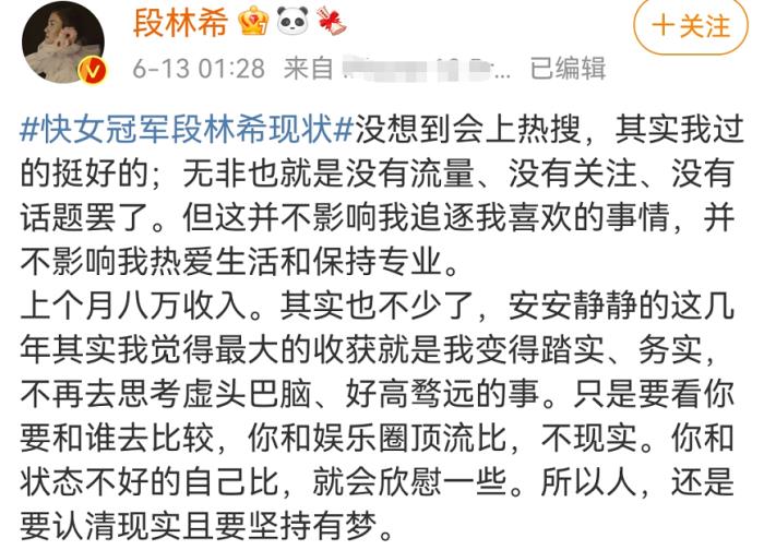 或许对于娱乐圈的明星来说,月薪八千无法支撑他们的生活,但很多人过得比这个更惨。只能说,祝福段林希好好生活吧,希望下次再出现在热搜上,是因为她带来好的作品。