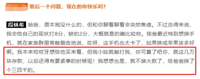 现在的她没有大富大贵的梦想,只想偶尔吃吃人均130元的餐厅。有时候她会焦虑自己的“穷”,爸爸想让她帮忙换手机,她只有几万块存款,买不了太贵的。