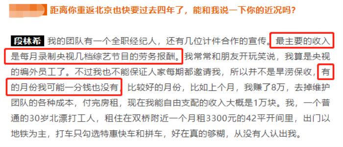 如今她的主要收入靠每月录制央视综艺节目的劳务报酬,有时候不被邀请,一个月一分钱都没有,比较好的时候,比如5月份,她赚了8万,能自由支配的收入是1万元。
