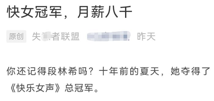6月12号,某杂志放出2011年《快乐女声》冠军段林希的专访文章,十年星途一路坎坷,她从大明星重回月薪八千的“素人”,故事引起网友热议,“快女冠军段林希现状”一度冲上热搜榜前三。