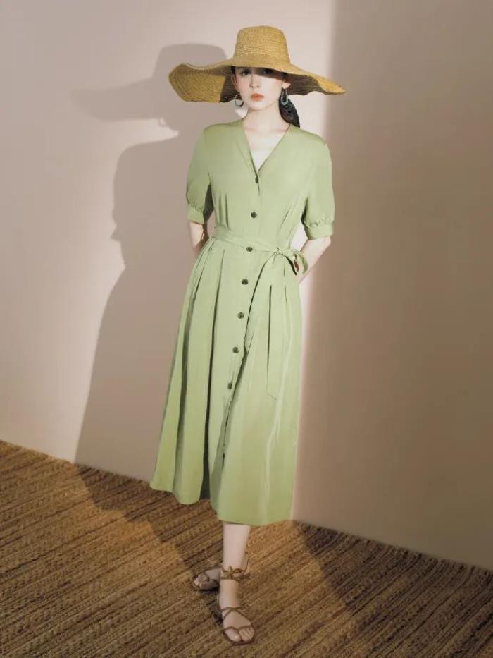 草绿色会稍微鲜亮一点,作为夏日的服装配色也更加推荐,自带清新属性加成,超级适合气质温柔的女生。像是娜扎穿着的这款草绿色桔梗裙, 简约又大方,只要找到合适的长度和版型大小,完全可以考虑入手一款。