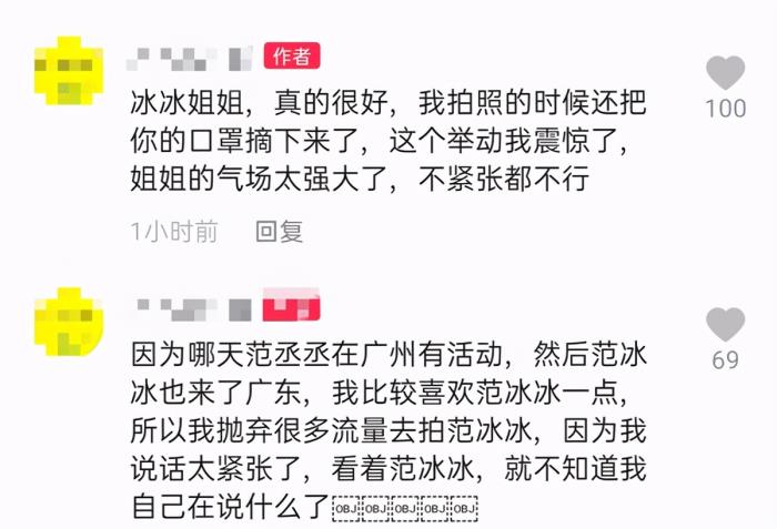 拍摄者在评论区也解释道“冰冰姐姐真的很好,我拍照的时候还把你的口罩摘下来了,这个举动我震惊了,姐姐的气场太强大了,不紧张都不行”,直呼对方气场强大被震慑住,他紧张到语无伦次。