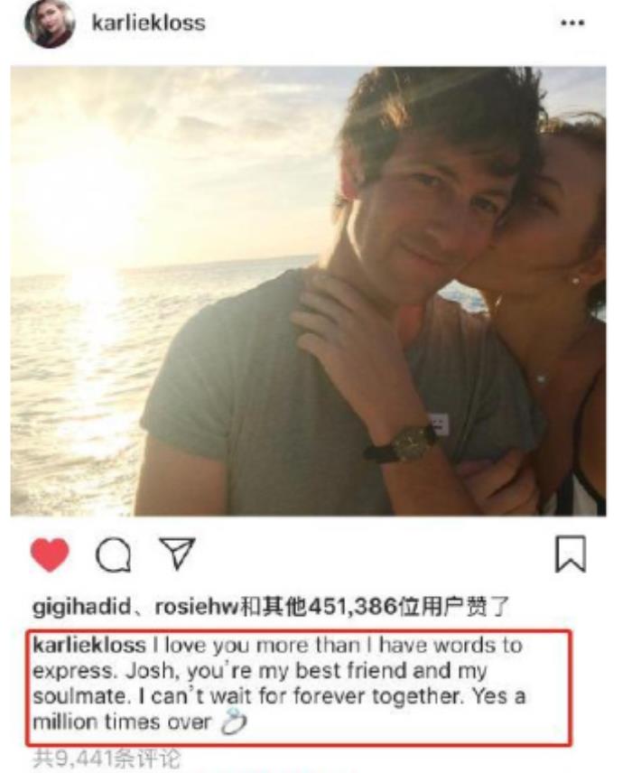小KK在社交媒体中写道:“我对你的爱超过任何语言,Josh你是我最好的朋友,我的灵魂伴侣,我等不及与你白头。Yes,一百万次Yes。”难掩幸福之情。