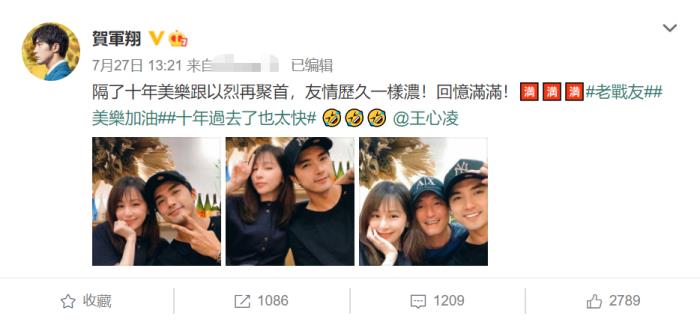 7月27日下午,王心凌在社交平台上发布了一组与贺军翔的合照,并配文道,美乐和以烈好久不见的老友聚会。瞬时间引起了一波回忆杀,网友大呼自己的青春回来了。