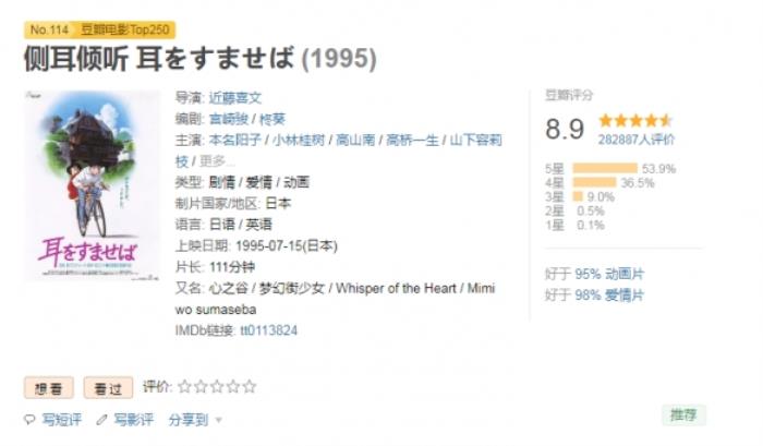 把《侧耳倾听》算在宫崎骏电影的榜单中有点牵强,因为电影是由多次在宫崎骏作品中出任作画监督的近藤喜文担任导演。不过宫崎骏是电影的编剧、制作监制、剧本、分镜。