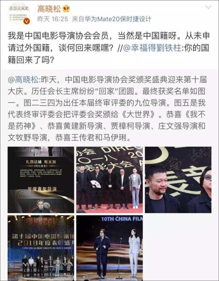 当日,高晓松发微博庆祝中国电影导演协会颁奖盛典圆满成功,有网友转发评论道:“你的国籍回来了吗”?