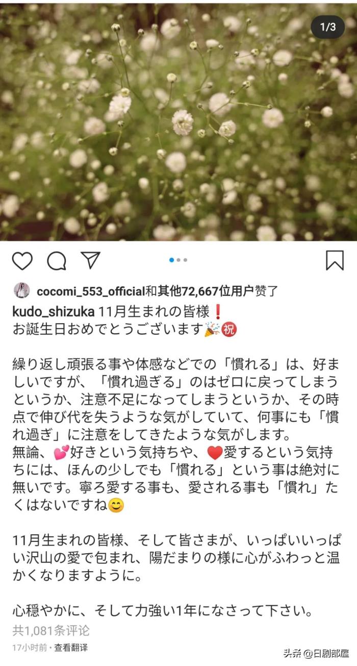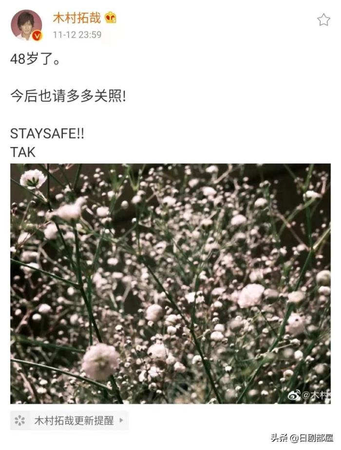 妻子工藤静香虽然没有直接祝贺老公,但也发了一条表示“祝福11月生日的人们”,并附上了与木村拓哉同款的配图。