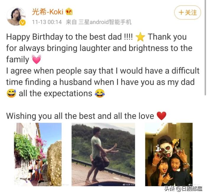 木村拓哉的两个女儿cocomi(木村心美)和koki(木村光希)也发来了祝福。