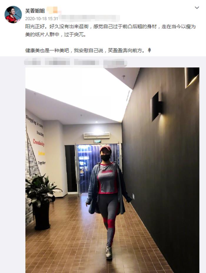 芙蓉姐姐今年虽然已经44岁了,但身材依然保持得很好,她认为自己的状态也很自信,发文评价自己“静如处子动如脱兔”,并表示自己还青春。