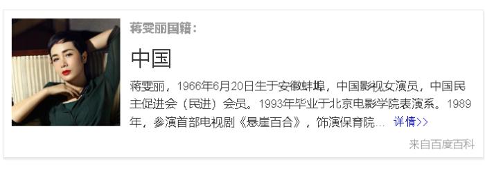 接着,网友又将目光转向了蒋雯丽,网上传出了:“蒋雯丽国籍系美国”的消息! 并且很快引起争论,毕竟这个话题是直击脑神经的。