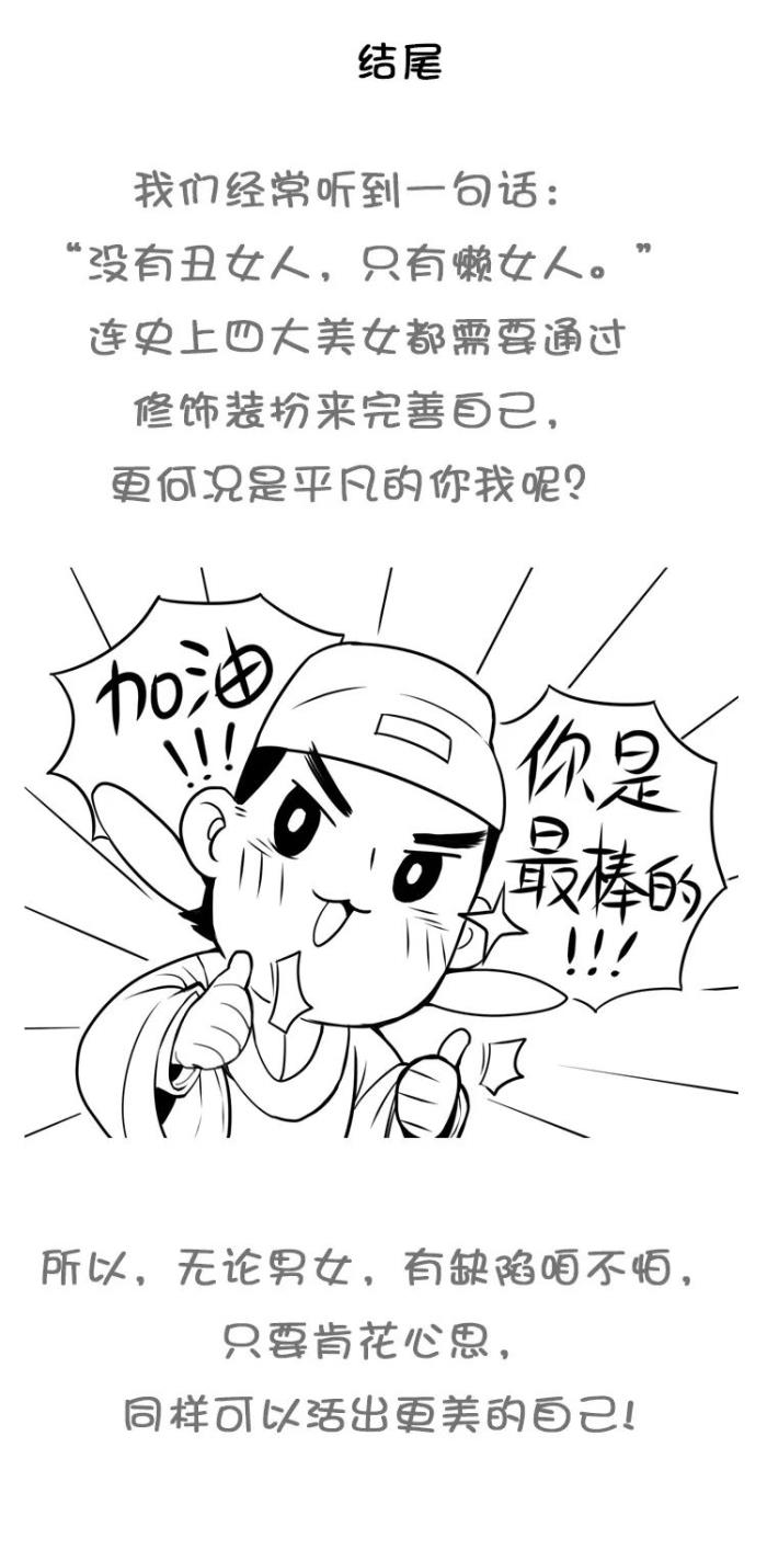 所以,不必说什么“没有丑女人,只有懒女人”的话,发现自己的问题,敢于面对,再借势遮掩……免去了皮肉之苦,也算得上是个聪明人哦。