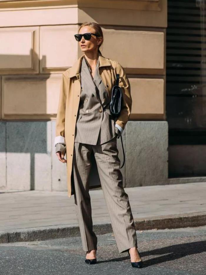 其次,我们可以选择风衣搭配整套的西装,打造一种职场风格,整个人的大女人气场十足。而西装套装的线条感比较明显,所以穿起来显的非常的整洁,西装裤的垂坠感比较强,让你的腿看起来又长又直。不过要注意一点的就是,鞋子的搭配上不能选择靴子款式,单鞋会更合适。
