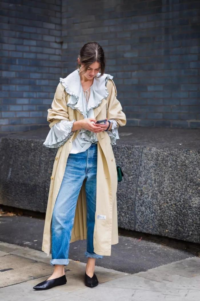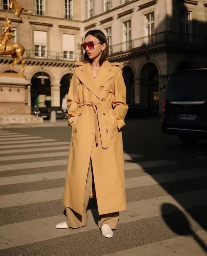 身材较为瘦的姐妹,适合紧身款,此时搭配一件较为宽松的风衣,斜斜的敞开就能够非常简单地透露出潇洒。